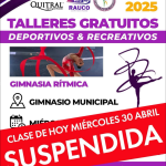 Informamos a todos nuestros beneficiarios que la clase de hoy de nuestro Taller de Gimnasia Rítmica por fuerza mayor, ha debido excepcionalmente suspenderse. 😉👌 Las clases se retoman con normalidad el próximo miércoles en nuestro Gimnasio Municipal. Gracias por su atención y comprensión 🙏🏻🙏🏻